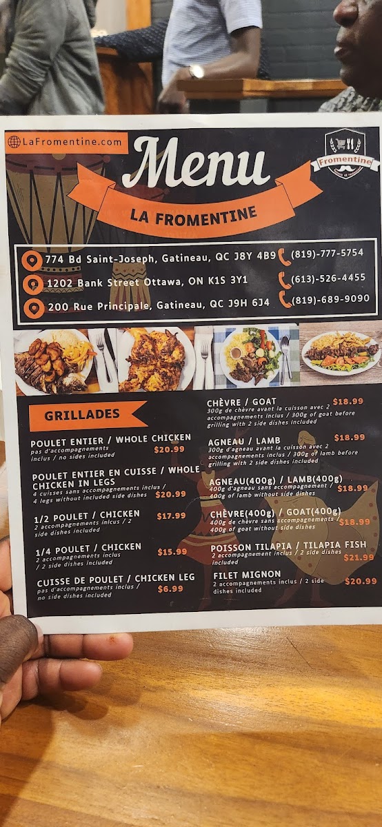 The menu at La Fromentine Inc 1202 Bank St. features a variety of flavorful options, including Half Chicken, Lamb, and Goat mains. The Family Dish of Whole Chicken or Whole chicken in legs is a great choice for sharing with loved ones. Accompaniments like Jollof Rice, Salad, Banana Plantain, and French Fries perfectly complement the main dishes.